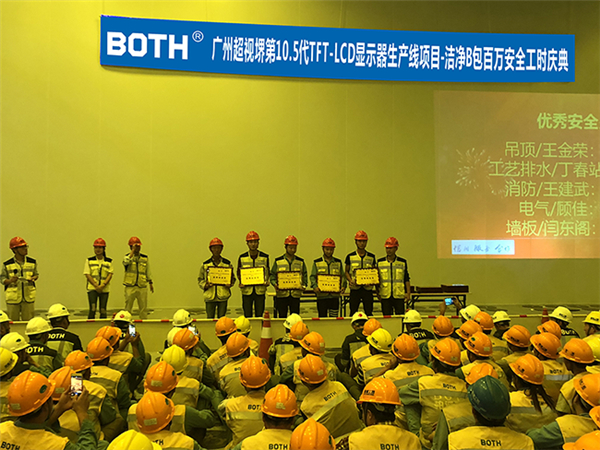 為了慶祝該項(xiàng)目取得的階段性成果,激勵(lì)項(xiàng)目全體人員,再接再厲、平安順利地完成項(xiàng)目后續(xù)工作,公司舉辦了廣州超視堺第10.5代TFT-LCD顯示器生產(chǎn)線項(xiàng)目潔凈B包100萬(wàn)安全工時(shí)慶典活動(dòng)。